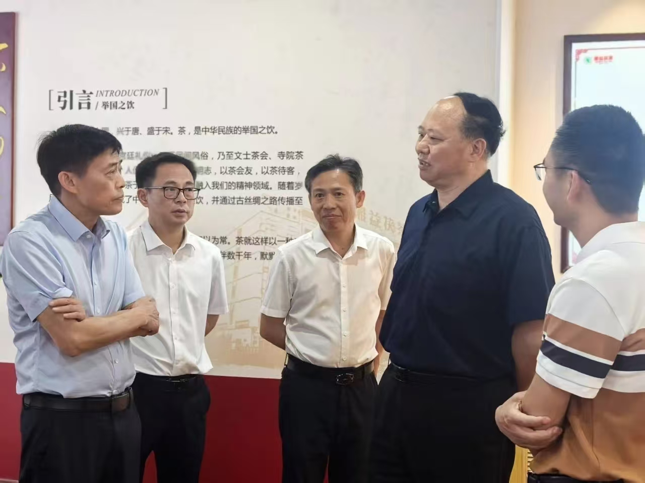 在董事長彭雄根、總經(jīng)理余智勇、國家級非遺傳承人劉杏益及副總經(jīng)理姚永軍的陪同下,調(diào)研組深入茯磚茶生產(chǎn)車間,觀摩了原料篩選、壓制、發(fā)花等核心工藝環(huán)節(jié)。文富恒主任委員在被譽(yù)為“茯茶靈魂”的“金花酵庫”,詳細(xì)詢問了冠突散囊菌群的培育技術(shù)與品質(zhì)控制標(biāo)準(zhǔn),對益陽茶廠在堅持傳統(tǒng)工藝基礎(chǔ)上推進(jìn)標(biāo)準(zhǔn)化、規(guī)?;a(chǎn)的實踐給予高度評價。隨后,調(diào)研組一行走進(jìn)湘益茶博館,通過歷史文獻(xiàn)、制茶器具及茯茶實物,系統(tǒng)了解茯磚茶發(fā)展脈絡(luò)和公司的發(fā)展歷程。