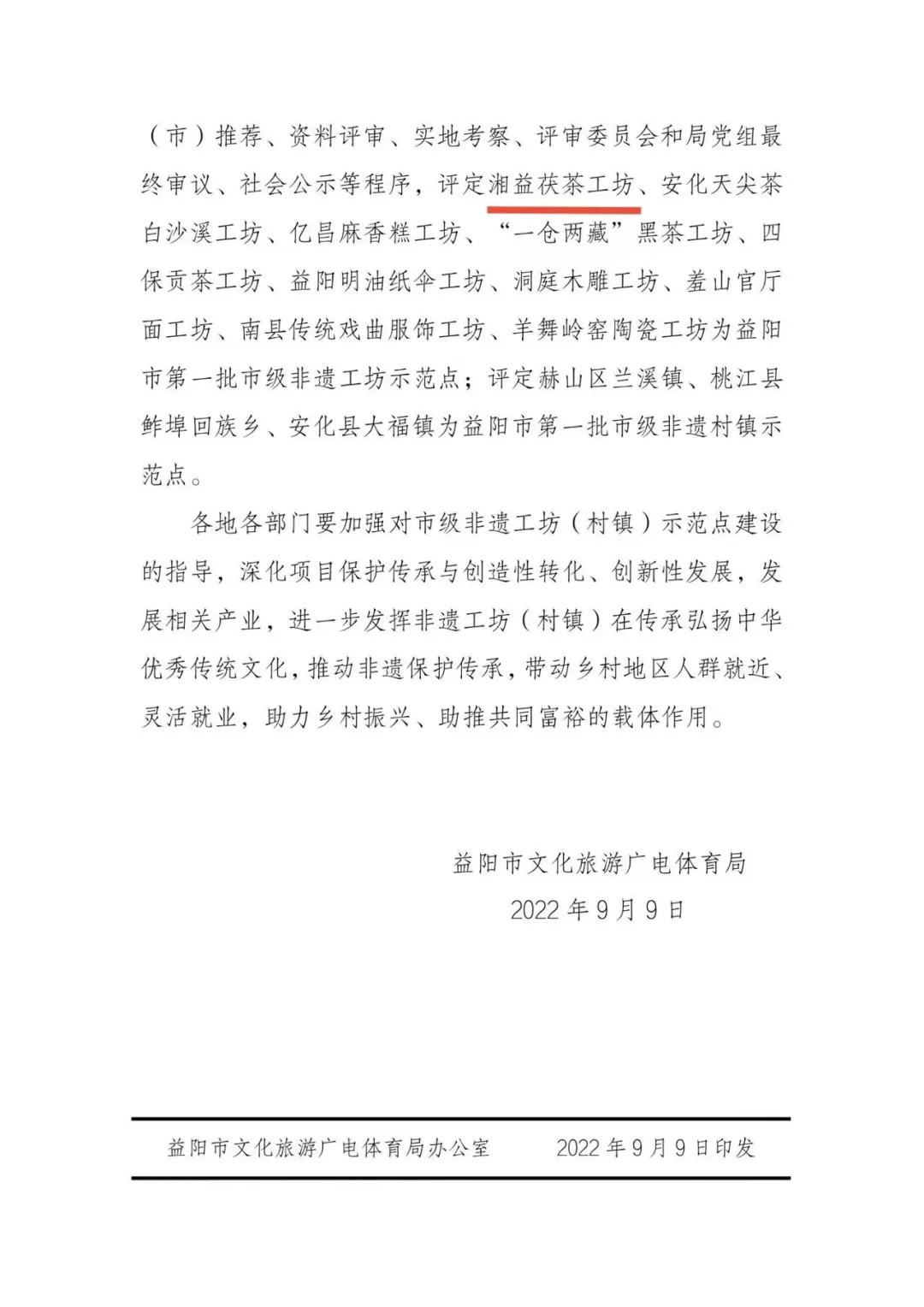 為深入貫徹中共中央辦公廳、國(guó)務(wù)院辦公廳《關(guān)于進(jìn)一步加強(qiáng)非物質(zhì)文化遺產(chǎn)保護(hù)工作的意見》有關(guān)精神,市文化旅游廣電體育局在全市開展非遺工坊、非遺村鎮(zhèn)、非遺街區(qū)示范點(diǎn)建設(shè)工作,經(jīng)區(qū)縣(市)推薦、資料評(píng)審、實(shí)地考察、評(píng)審委員會(huì)和局黨組最終審議、社會(huì)公示等程序,評(píng)定湘益茯茶工坊、安化天尖茶白沙溪工坊、億昌麻香糕工坊、“一倉(cāng)兩藏”黑茶工坊、四保貢茶工坊、益陽(yáng)明油紙傘工坊、洞庭木雕工坊、羞山官?gòu)d面工坊、南縣傳統(tǒng)戲曲服飾工坊、羊舞嶺窯陶瓷工坊為益陽(yáng)市第一批市級(jí)非遺工坊示范點(diǎn);評(píng)定赫山區(qū)蘭溪鎮(zhèn)、桃江縣鲊埠回族鄉(xiāng)、安化縣大福鎮(zhèn)為益陽(yáng)市第一批市級(jí)非遺村鎮(zhèn)示范點(diǎn)。